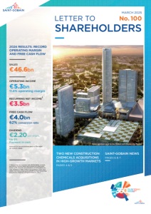 MARCH 2025 No. 100 SHAREHOLDERS LETTER TO 2024 RESULTS: RECORD OPERATING MARGIN AND FREE CASH FLOW SALES €46.6bn OPERATING INCOME €5.3bn 11.4% operating margin RECURRING NET INCOME1 €3.5bn FREE CASH FLOW €4.0bn 62% conversion ratio DIVIDEND €2.20 per share, Up 5% Payment in cash Amount to be recommended to the AGM on June 5, 2025 1. Recurring net income: net attributable income excluding capital gains and losses on disposals, asset write-downs, amortization of intangible assets related to PPA, IFRS 3 acquisition costs and other non-recurring items (material non-recurring provisions, impacts of hyperinflation, etc.) SAINT-GOBAIN NEWS PAGES 6 & 7 TWO NEW CONSTRUCTION CHEMICALS ACQUISITIONS IN HIGH-GROWTH MARKETS PAGES 4 & 5 Cemix solutions used for the Mitikah mall (Mexico city, Mexico) 360