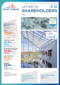 SAINT-GOBAIN NEWS IT ALL STARTSWITH SUPPLIERS First held in 2021, the Supplier’s Green Day reflects Saint-Gobain’s wish to engage its suppliers in the decarbonization of their activities. Raising awareness is all the more crucial as suppliers are one of the future drivers for action that will enable the Group to achieve its objective of carbon neutrality by 2050. The second edition of this event was attended by around 100 people, from Group suppliers and members of Purchasing, Sustainable Development and Innovation departments, to the ADEME, the French Agency for the Ecological Transition. SAINT-GOBAIN IN THE BLOOMBERG GENDEREQUALITY INDEX For the fifth consecutive time, Saint-Gobain has been included in the Bloomberg GenderEquality Index (GEI), which this year comprises 484 companies representing 45 countries. The index measures companies’ gender-equality performance on the basis of five criteria: leadership and talent pipeline, equal pay and gender pay parity, inclusive culture, anti-sexual harassment policies and brand image. SAINT-GOBAINGLASS RECYCLING, ANETWORKOF COLLECTORS AND HANDLERSOF BUILDING WASTE In France, Saint-Gobain has launched Saint-Gobain Glass Recycling, its new banner identifying a network of building waste treatment professionals, united around a common goal: to promote closed-loop recycling for flat glass. This recycling business, based on the principles of the circular economy, responds to two critical challenges: protecting natural resources and decarbonizing glass manufacture. The Saint-Gobain Glass Recycling banner groups together 31 companies and already covers much of the French market. INNOVATION INITIATIVE SAINT-GOBAINTOENTER THE GLASSWOOL INSULATION MARKET IN INDIA Saint-Gobain has entered into an agreement to acquire U.P. Twiga Fiberglass Ltd. (UP Twiga), the leader on the glass wool insulation market in India. UP Twiga operates two manufacturing facilities close to Delhi and Mumbai. The company has been a licensee of SaintGobain technology since 2005 for the manufacture of glass wool and its solutions offer a wide range of applications. Togetherwith the recent acquisition of Rockwool India Pvt Ltd. in stone wool and Saint-Gobain’s number 1 positions in plasterboard and glass, UP Twiga consolidates SaintGobain’s positioning in interior and façade solutions in India, set to benefit from stricter building performance requirements and the strong need for acoustic and thermal comfort as well as energyefficient solutions. Saint-Gobain is a leader in promoting green buildings in India with its comprehensive range of solutions for light and sustainable construction, its market- and customer-led innovation, and its strong brand recognition. The Group currently operates 33 manufacturing sites across India and has been significantly investing for growth in the country in recent years. STRATEGY CHALLENGES QUB: THE ENERGY PERFORMANCE GUARANTEE Using the power of data, the teams from Saint-Gobain in the UK and Saint-Gobain Recherche Paris have developed QUB, a solution to accurately measure the insulation of a building shell. An immediate challenge for the UK which, within the context of new legislation introducing an obligation to guarantee energy performance for new housing as from 2025, proves the importance of thermal renovation in the fight against climate disruption. This smartphone application is being developed and will accompany the launch of the solution on the UK market in 2023. CHALLENGES