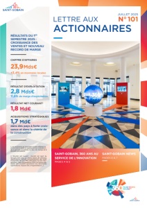 LES MOTS DE BENOIT BAZIN Président-Directeur Général de Saint-Gobain 2 LETTRE AUX ACTIONNAIRES N°101 RÉSULTATS S1-2025 « Le premier semestre 2025 démontre une fois de plus la solidité du nouveau profil de Saint-Gobain avec une hausse des ventes et des résultats, malgré un environnement attentiste dans certains marchés. L’Asie et les pays émergents continuent d’être des moteurs de croissance pour le Groupe et l’Europe poursuit son amélioration séquentielle, alors que l’Amérique du Nord connaît un léger repli de ses ventes. Avec l’intégration de nos récentes acquisitions, nous avons renforcé la qualité du profil du Groupe en matière de croissance rentable et pouvons ainsi nous appuyer sur une contribution équilibrée de nos résultats en trois zones géographiques. Notre modèle opérationnel décentralisé par pays, sans exposition directe aux barrières douanières, est la clef de la force du Groupe face aux chocs externes. Les Directeurs Généraux de pays pilotent désormais l’intégralité de notre offre de solutions afin d’accélérer la croissance du Groupe sur chacun de ses canaux et de ses marchés finaux. Malgré un contexte macroéconomique encore contrasté et géopolitiquement incertain, je suis confiant que 2025 marquera une nouvelle année de succès pour Saint-Gobain, grâce à l’engagement des équipes, que je salue. A l’occasion de la journée investisseurs du 6 octobre prochain, nous partagerons les nouvelles ambitions du Groupe, leader mondial de la construction durable, en termes de croissance rentable et de surperformance, ainsi que de création de valeur pour l’ensemble de nos parties prenantes. » • Chiffre d’affaires en croissance de +3,4% au premier semestre 2025 en monnaies locales • Record de marge d’exploitation à 11,8% • Records d’EBITDA et de résultat d’exploitation en monnaies locales, en croissance de respectivement +7,0% et +5,0% • BNPA (Bénéfice Net par Action) courant à un niveau record et 63% de taux de conversion de cash flow libre • Acquisitions stratégiques pour 1,7 Md€ dans la chimie de la construction, avec Cemix (Amérique latine), FOSROC (Inde et Moyen-Orient) et autres acquisitions ciblées (Maturix, Interstar Materials, Soquimic, Isoltech) UN NOUVEAU PROFIL DE CROISSANCE RENTABLE Perspectives 2025 confirmées : le Groupe vise une marge d’exploitation supérieure à 11,0% Le Groupe continue de surperformer ses marchés grâce à la force de son positionnement stratégique de leader mondial de la construction durable : • Une offre inégalée de solutions durables et innovantes, s’appuyant sur des systèmes intégrés et une offre bas carbone qui fait référence ; • Un positionnement fort dans la chimie de la construction avec 6,5 milliards d’euros de chiffre d’affaires annuel (pro forma 2024 des évolutions de périmètre récentes). Les intégrations au cours du premier semestre de Cemix en Amérique latine et de FOSROC en Inde et au Moyen-Orient renforcent la présence de Saint-Gobain dans les pays à forte croissance ; • Un modèle opérationnel performant et éprouvé par pays, renforcé encore depuis le 1er juillet, avec une organisation complètement régionalisée pour accélérer la croissance des solutions pays par pays sur chaque segment de marché (notamment résidentiel, « data centers », hôpitaux, écoles, infrastructure) ; • Une contribution équilibrée du résultat d’exploitation en 3 zones géographiques : environ 35% Amérique du Nord, 33% Asie et pays émergents et 32% Europe occidentale, ce profil géographique ayant été atteint grâce au renouvellement d’environ 40% des ventes depuis 2018 ; • Un profil financier transformé : une marge structurellement plus élevée, un taux de conversion du free cash flow structurellement supérieur à 50% et un doublement du bénéfice net par action depuis 2018.